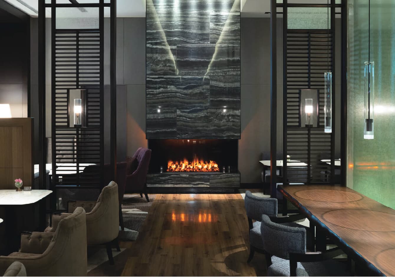 落ち着いてくつろげるラウンジの空間演出に電気暖炉を採用。