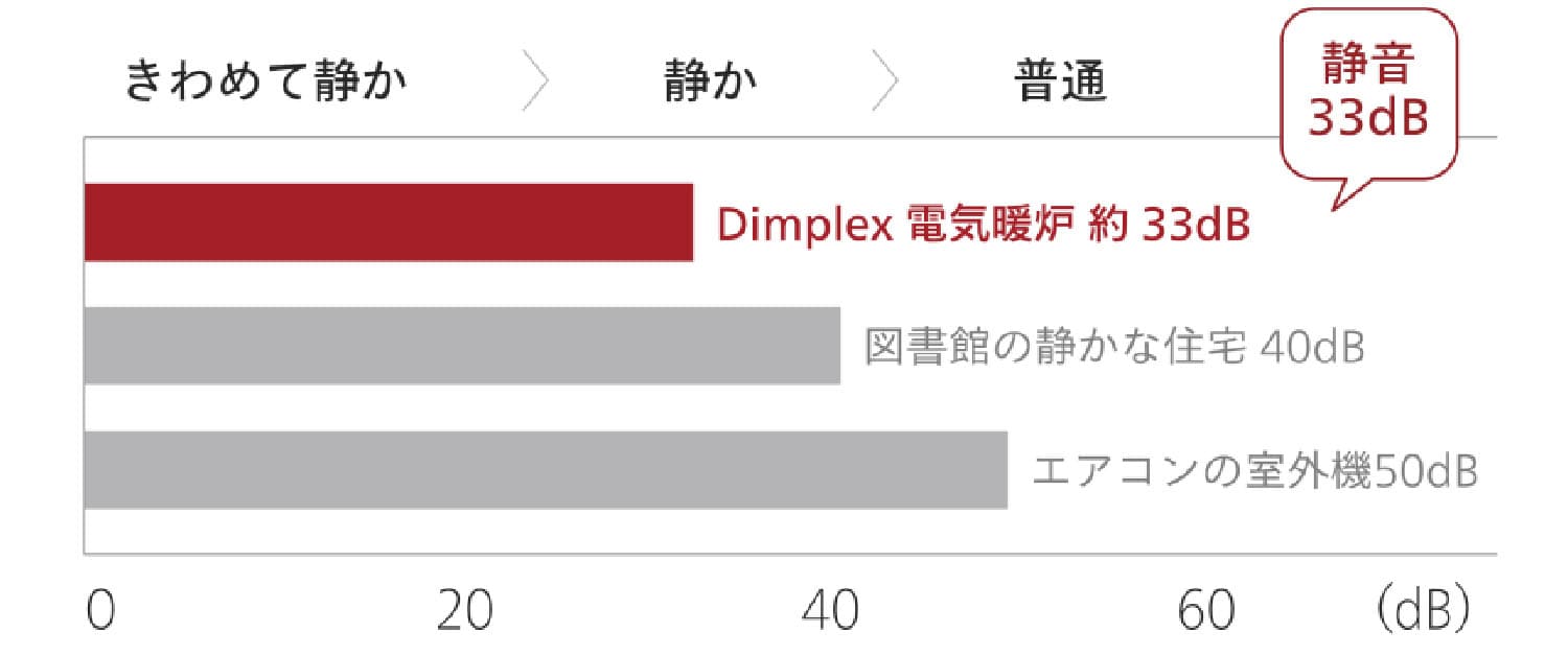 部屋に置くものは、静かな方がいい。 ディンプレックスのインテリア暖炉の作動音は、約33dBの静音設計です。