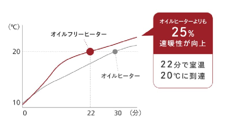 「空気を汚さない」「乾燥しにくい」「音が気にならない」という従来のオイルヒーターの特長はそのままに、オイルフリーヒーターは速暖性が25%UP。待てない冬も、すぐに、からだを芯からあたためます。さらに、安心性能や使い勝手の良さも向上しました。