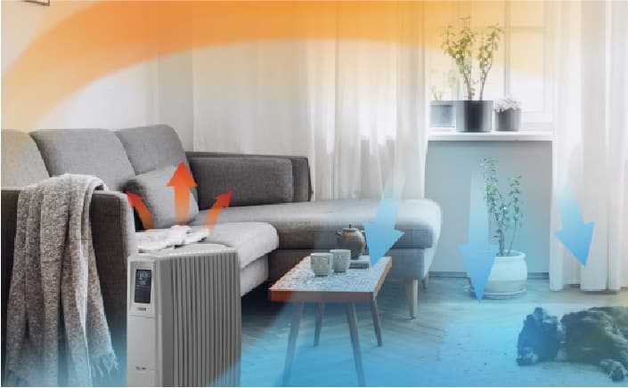 上部からのパワフルな自然対流熱でコールドドラフトを抑え、お部屋をむらなくあたためます。