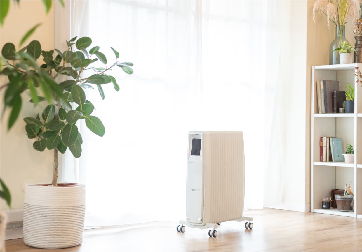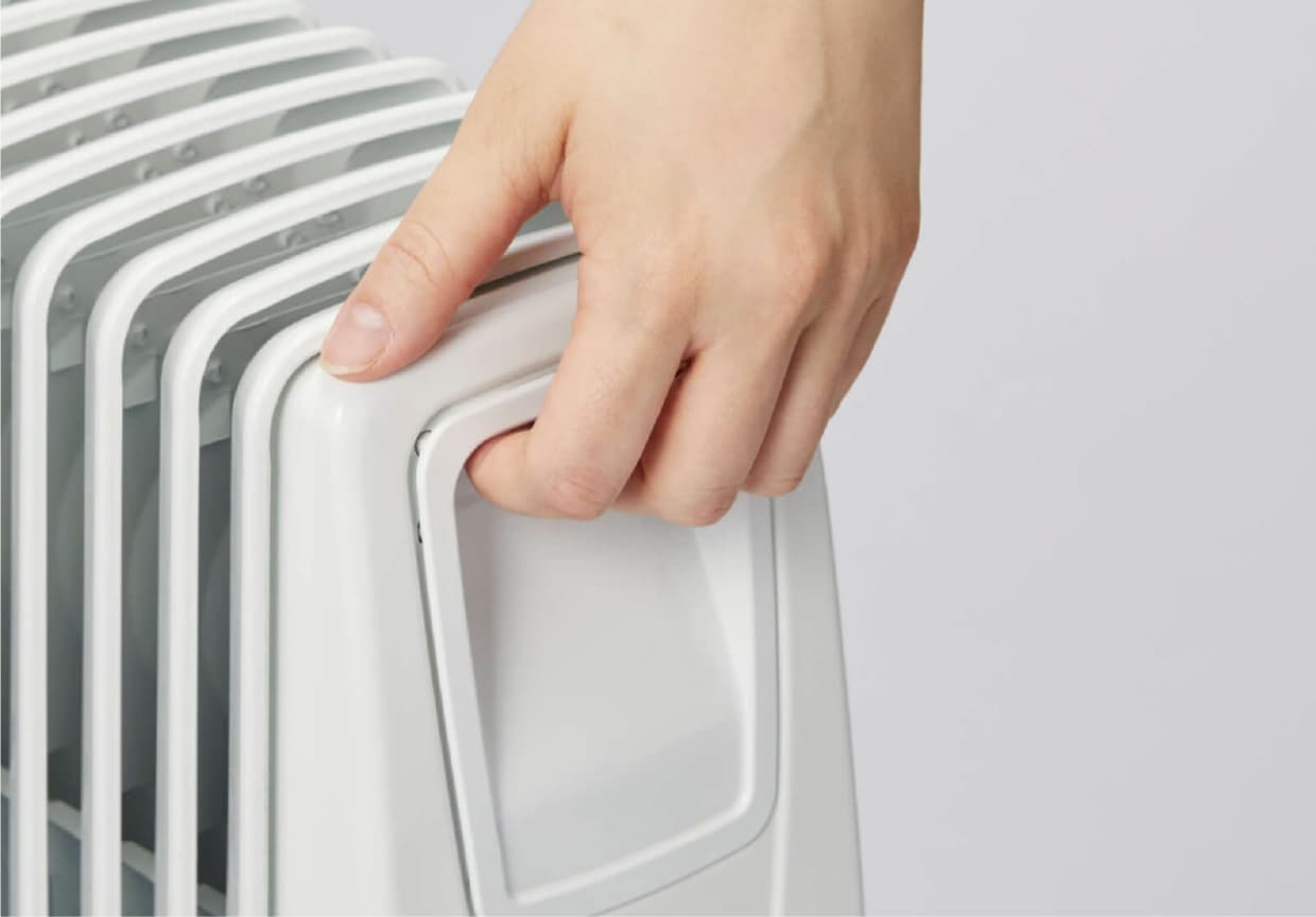 オイルを使わないため、同等サイズの一般的なオイルヒーターに比べ、本体が格段に軽くなり、従来製品より10%以上軽量化を達成。部屋から部屋への移動もラクに行えます。