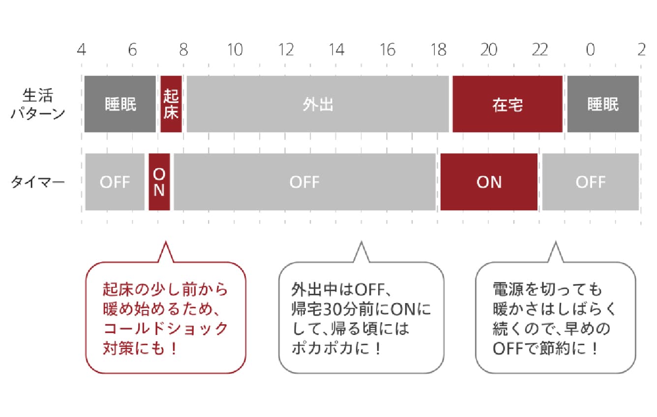 ウィークリータイマーなら、曜日ごとに起床・就寝時間に合わせて、電源のON/OFFが可能。もちろんそれぞれの時間の室温設定が可能です。